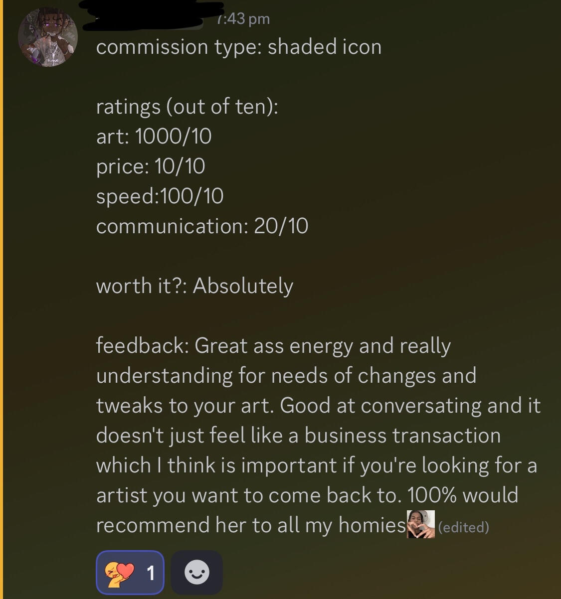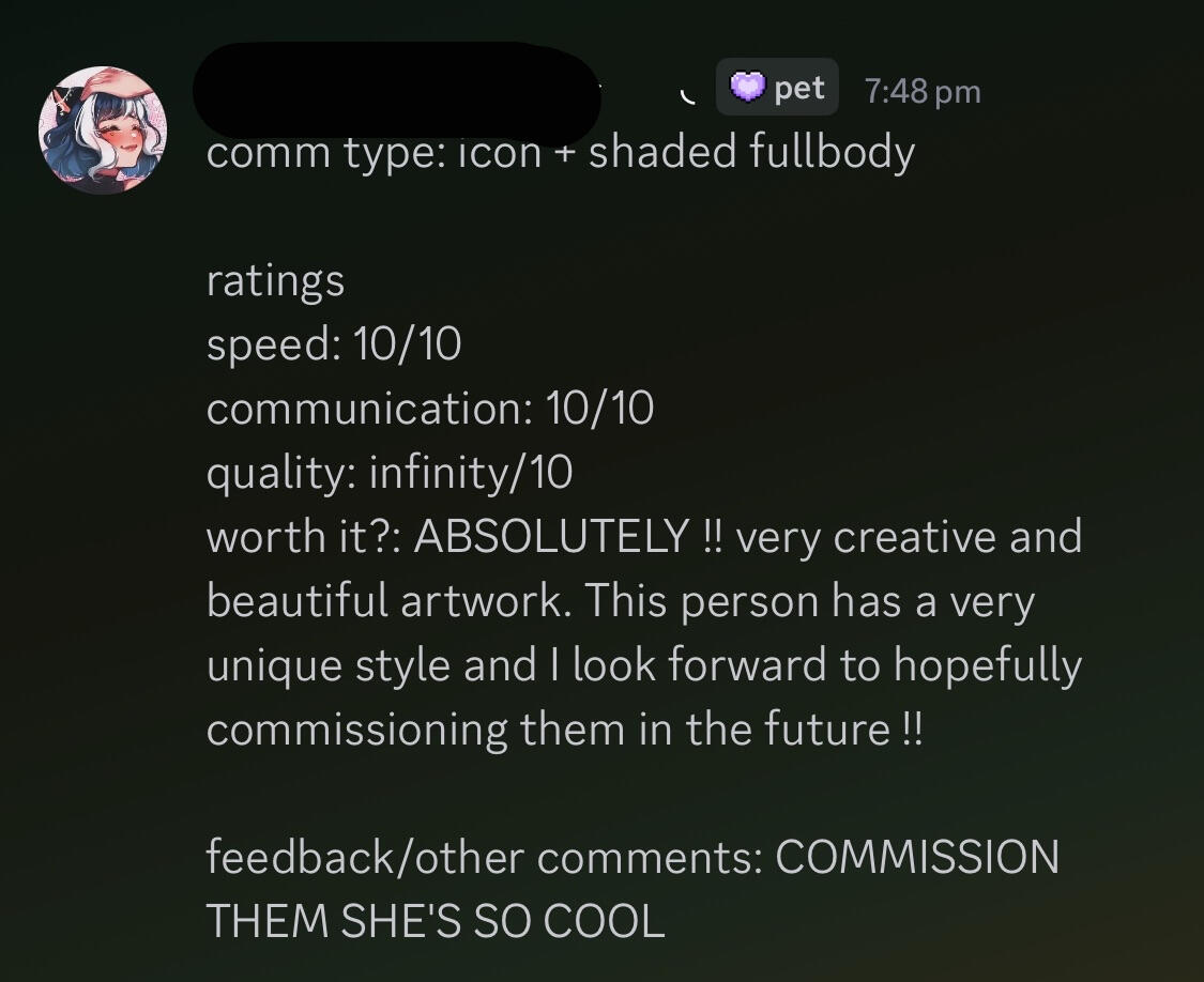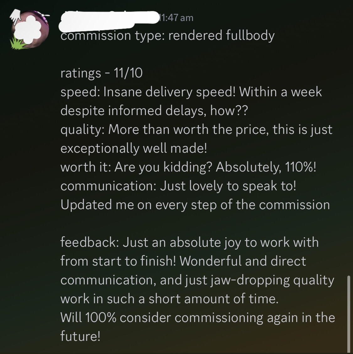 from all my lovely clients! i'll politely ask you to also fill out a review form once i have completed your commission (you of course may decline)current overall rating: 9.8/10