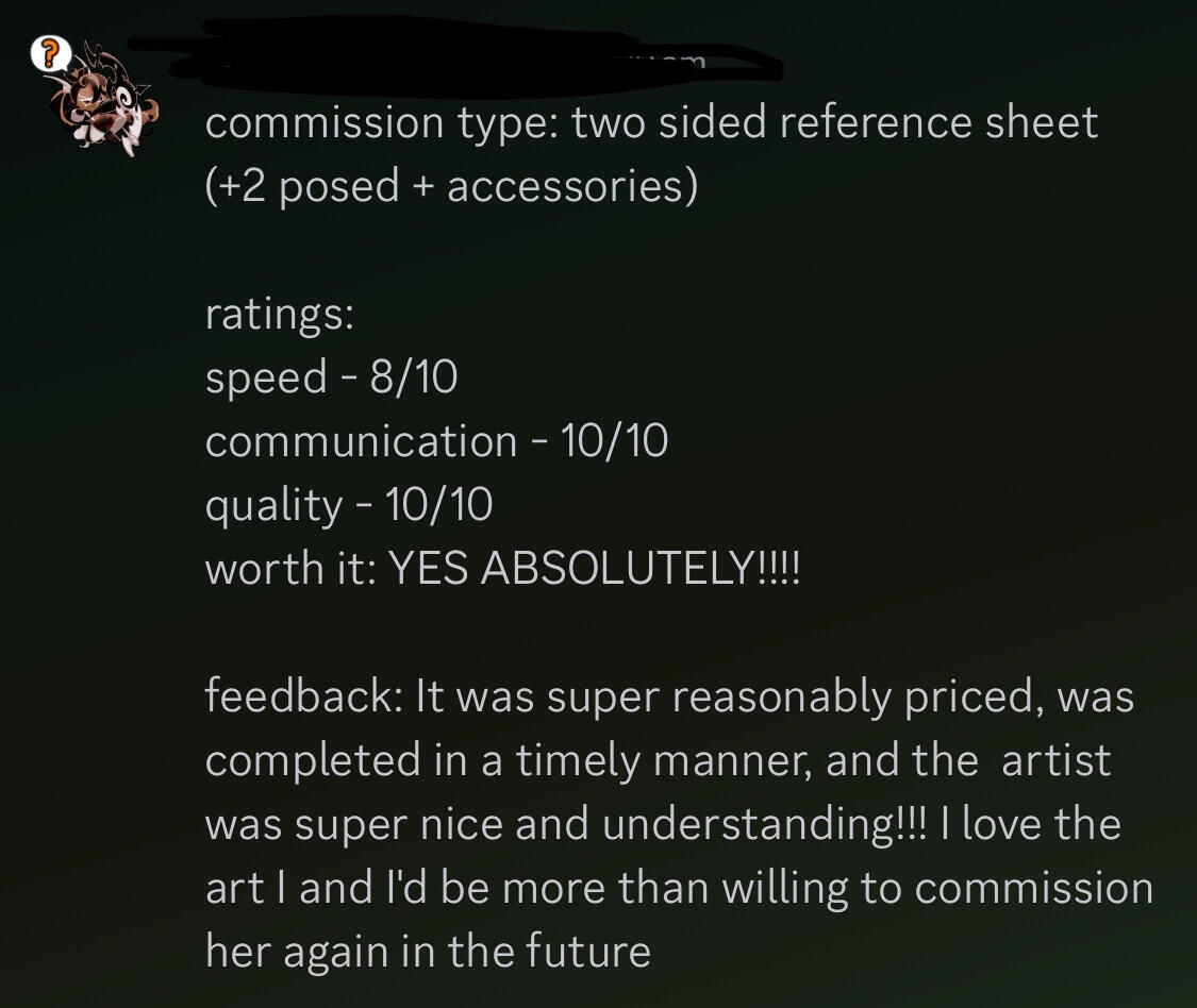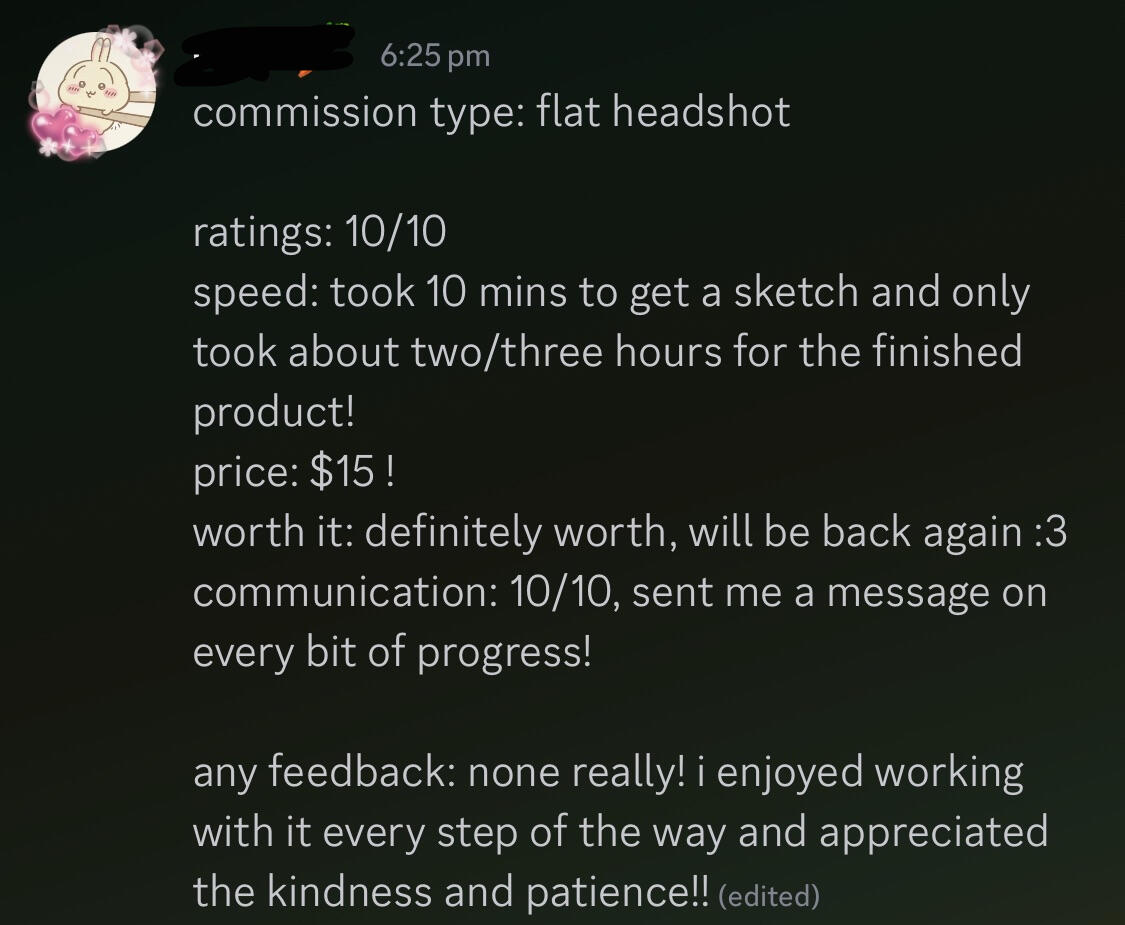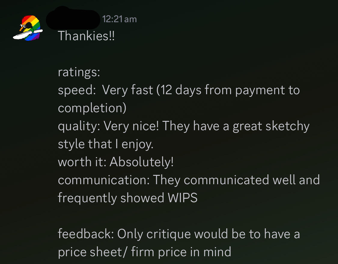 from all my lovely clients! i'll politely ask you to also fill out a review form once i have completed your commission (you of course may decline)current overall rating: 9.8/10